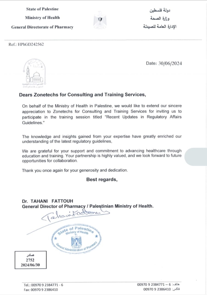 كل الشكر والتقدير لوزارة الصحة الفلسطينية على ثقتها بشركة (Zonetechs for Consulting and Training Services) نحن فخورون بتقديم خدماتنا ومساهمتنا في تحسين جودة الرعاية الصحية في فلسطين. إن ثقتكم تعزز من التزامنا بتقديم الأفضل ونسعى دائمًا لتحقيق التفوق في كل ما نقدمه