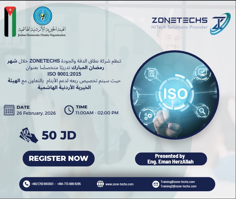 mohamad2026-01-13 18:30:412026-01-20 10:22:55Regulatory Affairs in the Pharmaceutical Industry: Your Gateway to a Promising Career Training December 27th, 2025تنظم شركة نطاق الدقة والجودة Zonetechs خلال شهر رمضان المبارك تدريبًا متخصصًا بعنوان ISO 9001:2015 . حيث سيتم تخصيص ريعه لدعم الأيتام بالتعاون مع الهيئة الخيرية الأردنية الهاشمية.